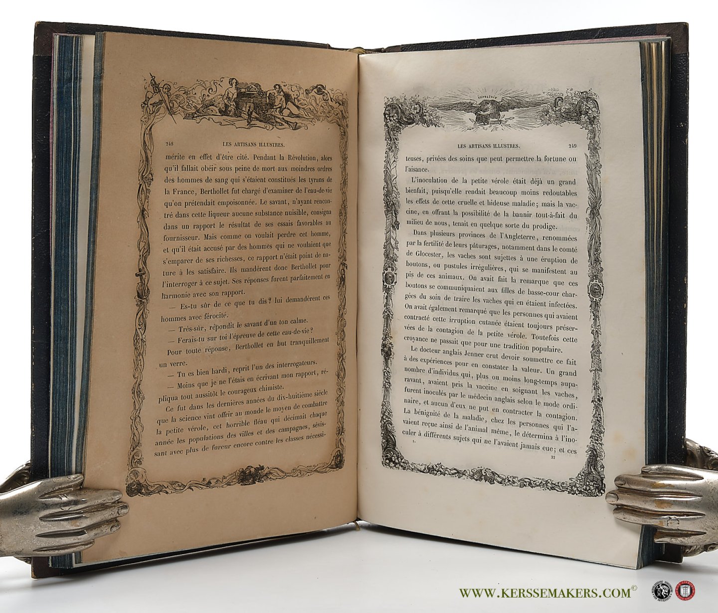 covers surrounded by gilt border and gilt decorations on all the corners. Edges painted and decorated. Decorated rose endpapers. (iv),643,(i:blank) pp. With portait of Laffitte,(livre publié sous ses auspices), engraved by Laisné after Fragonard. With protective tissue paper. With many nice woodcuts in text: scenes and portraits. Every page with ornamental garlands around the text. "Artisans, artistes, fabricants, industriels et autres personnages (inventeurs, etc.)". - Printed on thin white paper. Very good, almost spotless, interior condition. And, apart from some very small rubbings, in a beautiful contemporary binding.