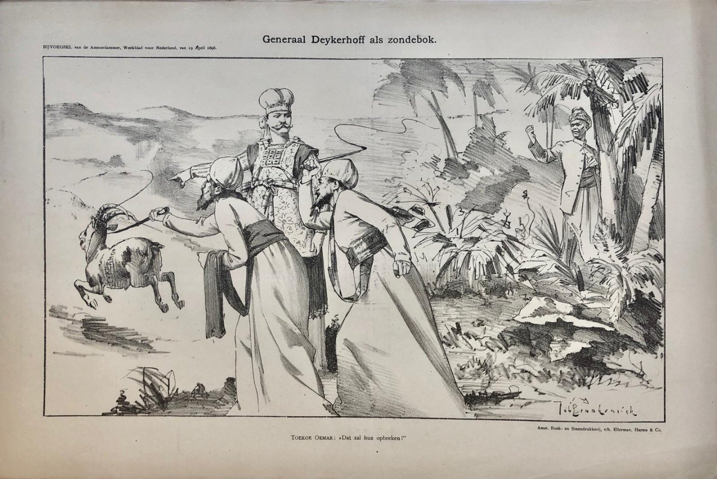 | Bijzonderheden: | 300 x 440 mm. Bijvoegsel van de Amsterdammer, Weekblad voor Nederland van 19 April 1896. Generaal Deykerhoff als zondebok. Pictured is Toekoe Oemar. Amst. Boek- en Steendrukkerij, v/h. Ellerman, Harms & Co. |