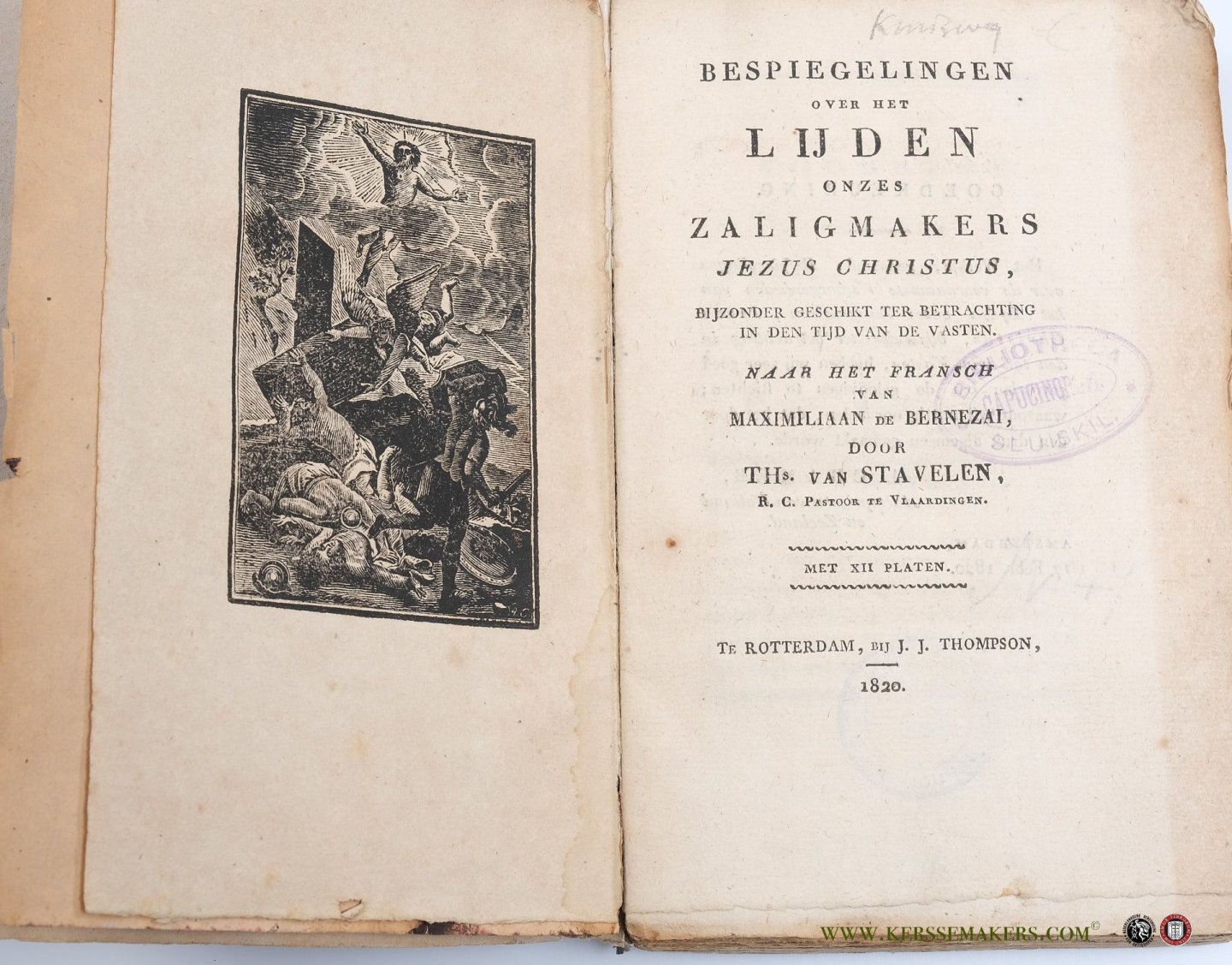 | Titel: | Bespiegelingen over het lijden onzes zaligmakers Jezus Christus, bijzonder geschikt ter betrachting in den tijd van de vasten. Naar het Fransch van Maximiliaan de Bernezai door THs. van Stavelen, R. C. pastoor te Vlaardingen. Met XII platen. |