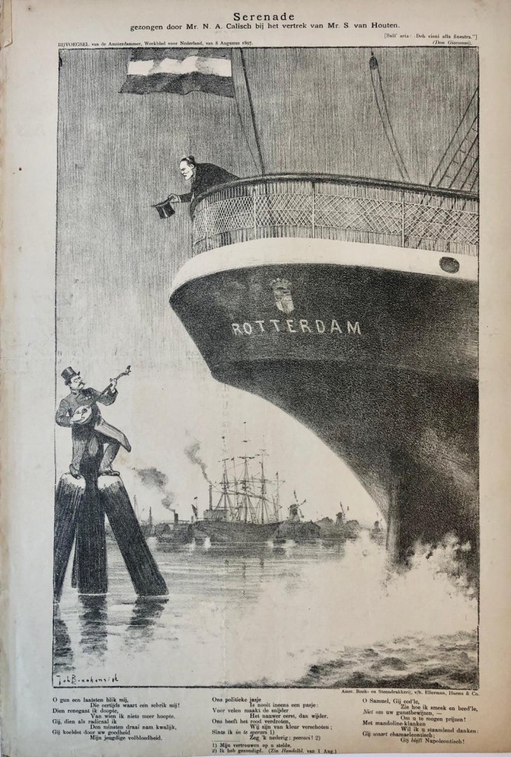 | Bijzonderheden: | 440 x 300 mm. Bijvoegsel van de Amsterdammer, Weekblad voor Nederland van 8 Augustus 1897. Serenade gezongen door Mr. N. A. Calisch bij het vertrek van Mr. S. van Houten (Minister van Binnenlandse Zaken, Minister of Internal Affairs). Amst. Boek- ... |