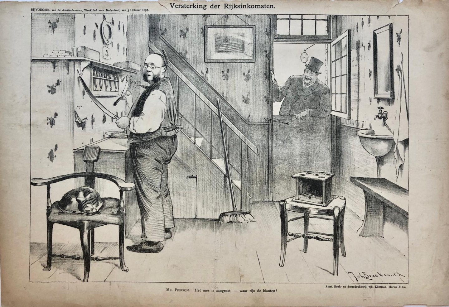| Titel: | [Original lithograph/lithografie by Johan Braakensiek] Versterking der Rijksinkomsten, 3 October 1897, 1 pp. |