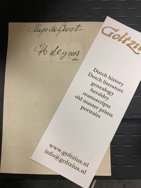 | Meer info: | Hugo de Groot/Hugo Grotius, autograph pasted on 19th leaflet. Original (?) autograph of Hugo de Groot/Hugo Grotius, dated 1610, autograph cut from larger document and pasted on 19th century paper. |