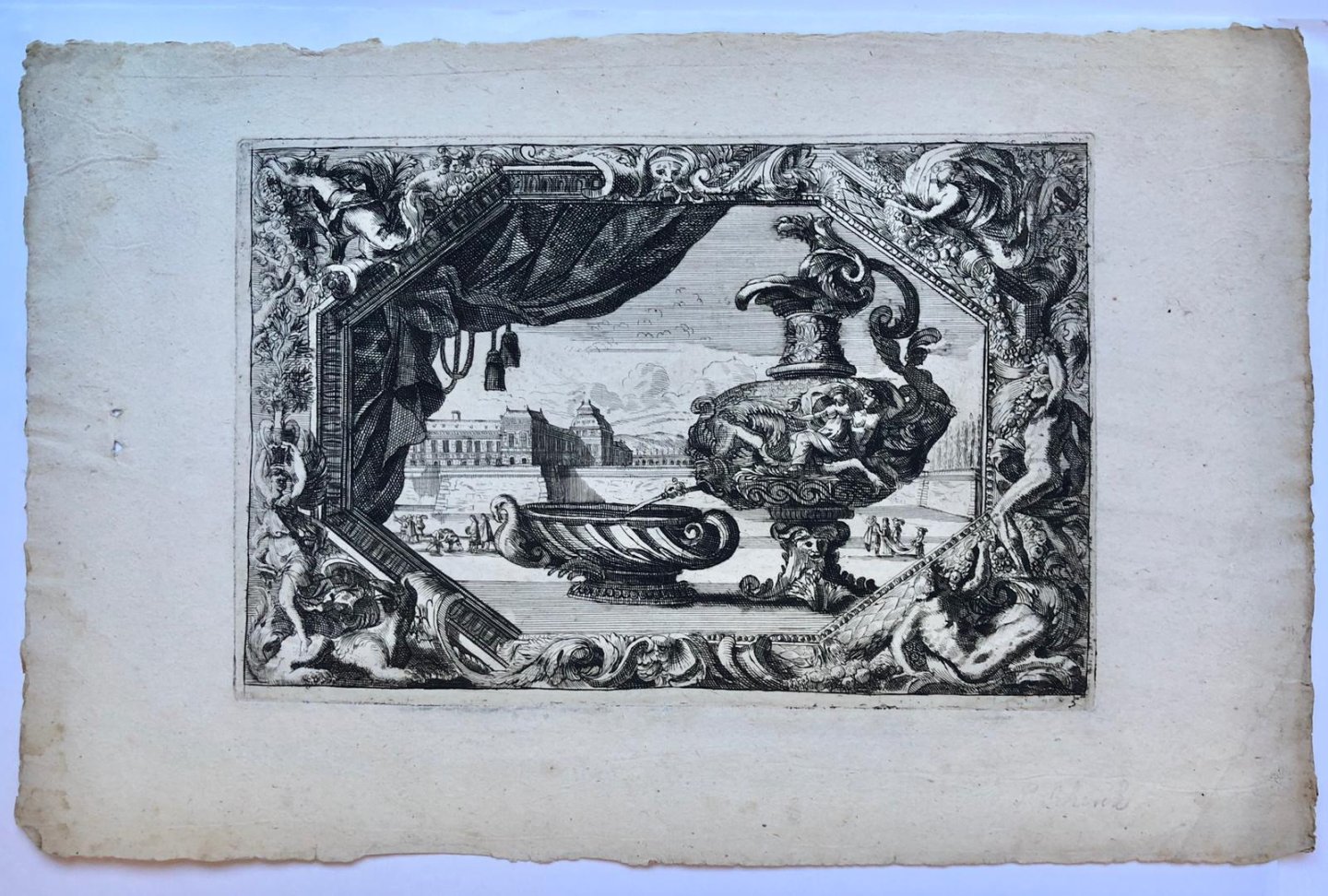| Bijzonderheden: | Plate from a set of six plates featuring a large decorative vase pouring water on a basin in a gallery. In the background a royal palace (Versailles?). In the same direction as Le Pautre's original, within a highly decorative frame. Numbered at bo... |