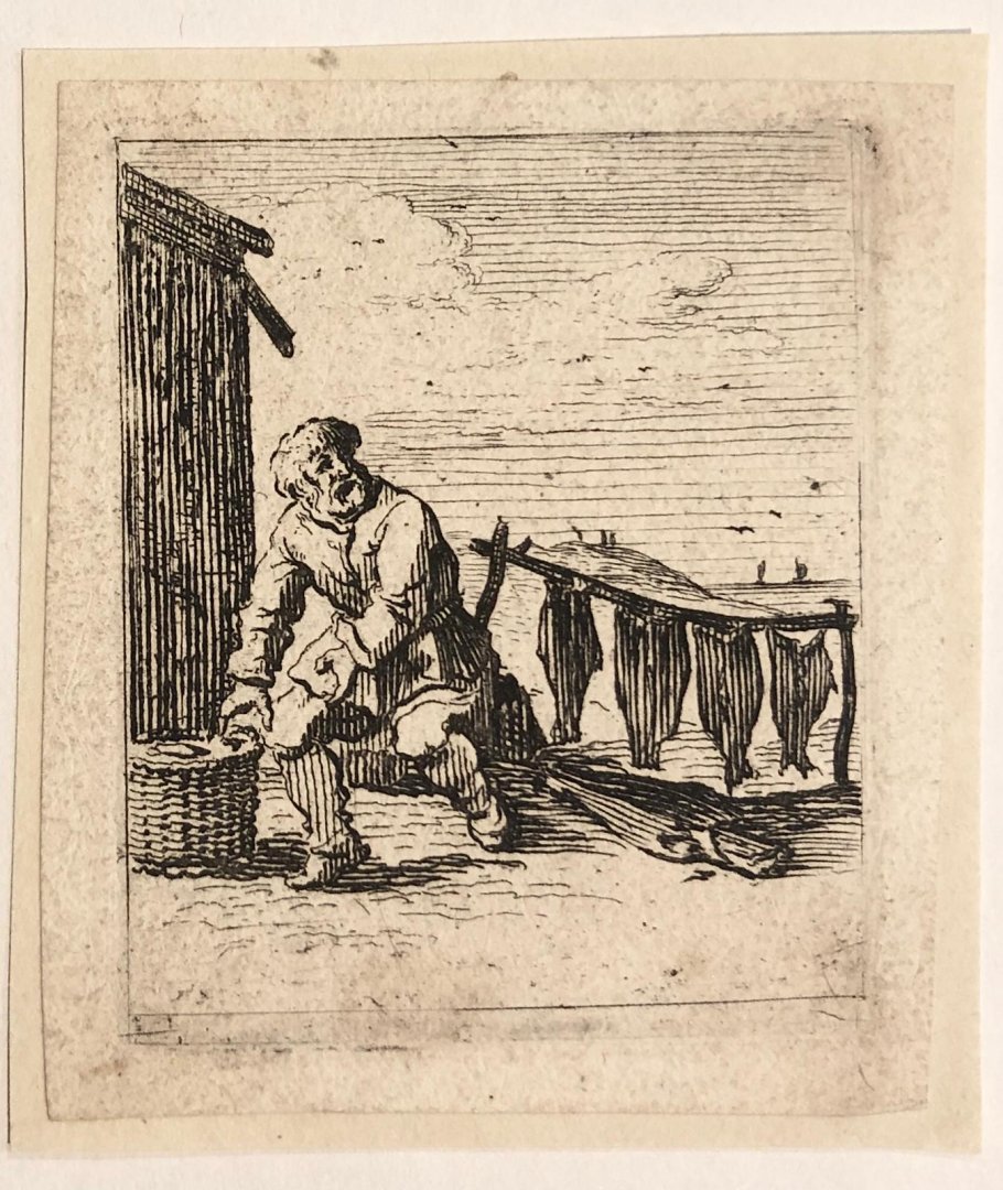 Bijzonderheden: A bearded man at left placing fish on a rock; impression nr. 8 from a set of 32 plates with various genre scenes. State before numbering and titles.