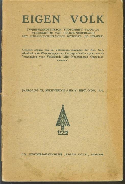 | Titel: | Eigen volk,( Dubbelnummer aflevering 5 en 6 / sept en nov 1939 )algemeen tijdschrift voor volkskunde (folklore) en dialect voor Nederland, Oost- en West-Indi�, Vlaanderen, Zuid-Afrika en Noord-Amerika, Heraldisch en genealogisch bijvoegsel |
