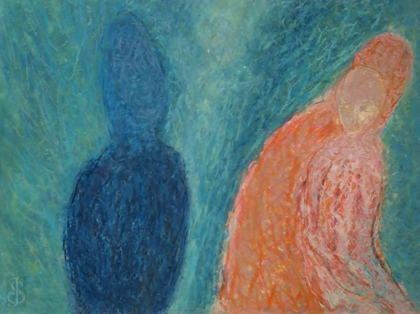 Originele tekening, gesigneerd op verso \"Lucienne Stassaert 88\"\nKrijt en gemengde techniek\n# Lucienne Stassaert (Antwerpen 1936). Dubbeltalent, auteur van proza, theater en poëzie én beeldend kunstenaar. \n\"Zij tekent geen herinneringen, maar de herinnering. Zij tekent geen eenzame mensen, maar de eenzaamheid. Hier wordt nergens de visuele werkelijkheid nagebootst. Hier wordt de innerlijke realiteit blootgesteld. Daarom is dit werk zo sterk met emotie geladen.\" dixit Willem M. Roggeman.