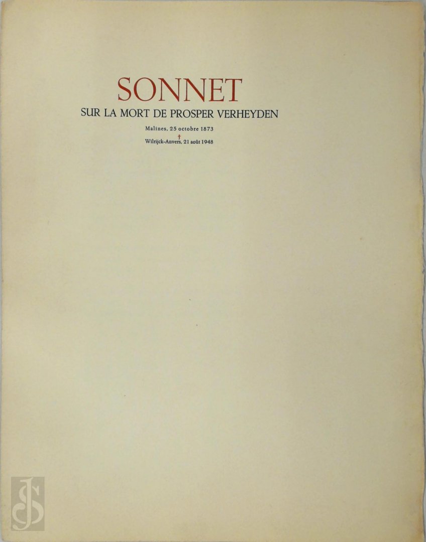 Gelegenheidsdrukwerk n.a.v. het overlijden van Prosper Verheyden (Malines, 25 octobre 1873 / Wilrijck-Anvers, 21 août 1948).\nSonnet door Georges Sustendal, gedateerd 'Anvers, 21 aoüt 1948'.\nTypografie Jos Leonard, gedrukt in twee kleuren (rood en zwart)\n4p, (geplooid plano)\nTypisch klassiek drukwerk van meester-typograaf Jos Leonard