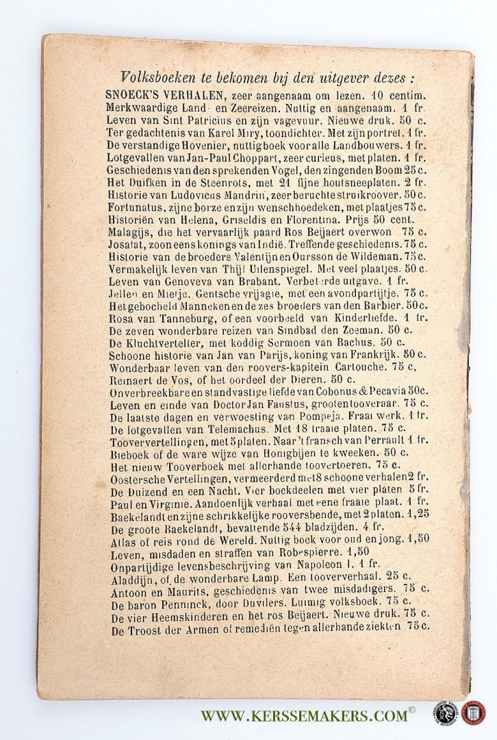 | Bijzonderheden: | c. 1880, Small 8vo (14,7x9,8 cm). Orig. printed wrappers, with ornamental border on frontcover and publisher's list on backcover. 24 pp. and 2 pages with reproduction of 2 title-pages. On title "Prijs 25 centiemen", corrected on frontcover with st... |