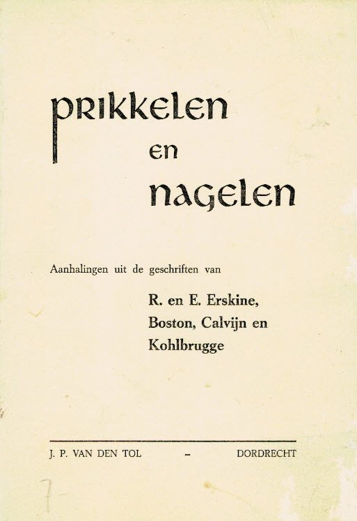 Prikkelen en nagelen, aanhalingen uit geschriften van R. en E. Erskine, Boston, Calvijn en Kohlbrugge. C.J. de Haan te Delft zegt in zijn voorwoord: Mogen zij menigeen stof geven tot overdenking en de lust op wekken meer van deze schrijvers te lezen. |