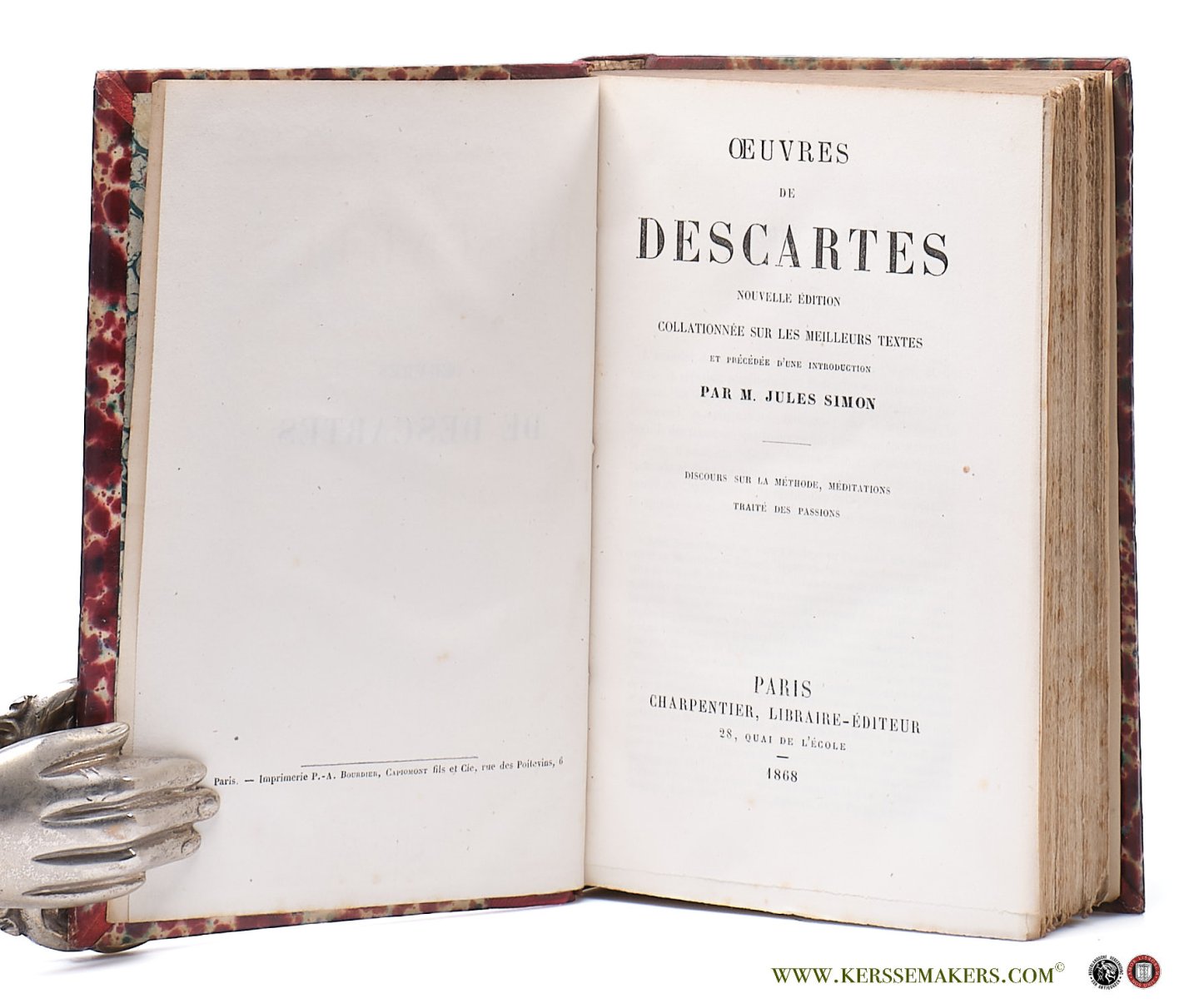 | Titel: | Oeuvres de Descartes. Nouvelle édition collationnée sur les meilleurs textes et précédée d'une introduction par M. Jules Simon. Discours sur la methode, meditations, traite des passions. |