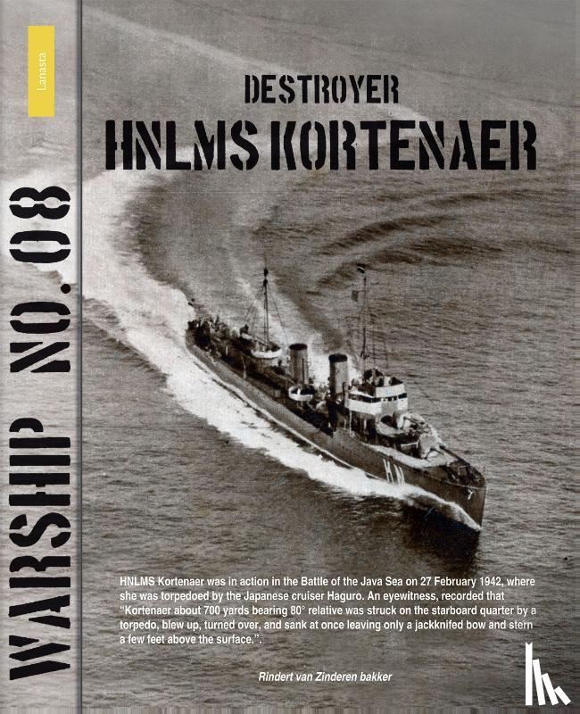 Flaptekst HNLMS Kortenaer was in action in the Battle of the Java Sea on 27 February 1942, where she was torpedoed by the Japanese cruiser Haguro. An eyewitness, recorded that “Kortenaer about 700 yards bearing 80° relative was struck on the starboard quarter by a torpedo, blew up, turned over, and sank at once leaving only a jackknifed bow and stern a few feet above the surface.”. |