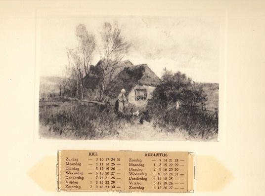 Arnhem, C.A. Rupp, [1935?]. Liggend formaat 25 x 33 cm. Vier eenzijdig bedrukte bladen met sierkoord. Natuurtaferelen in zwartwitlitho's met beweegbare maandaanduidingen. Voorblad verkleurd. Geen jaartal vermeld, maar de kalender betreft wellicht het jaar 1937. Garjeanne (1860-1930) was tekenleraar in Venlo en Hilversum.