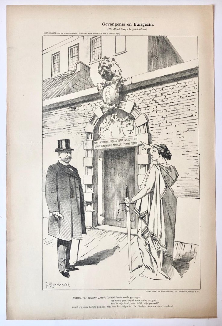 | Bijzonderheden: | 460 x 300 mm. Bijvoegsel van de Amsterdammer, Weekblad voor Nederland, van 4 October 1903. Gevangenis en huisgezin (De Middelburgsche geschiedenis). Pictured are Justitia and Minister Loeff. Amst. Boek- en Steendrukkerij, v/h Ellerman, Harms &... |