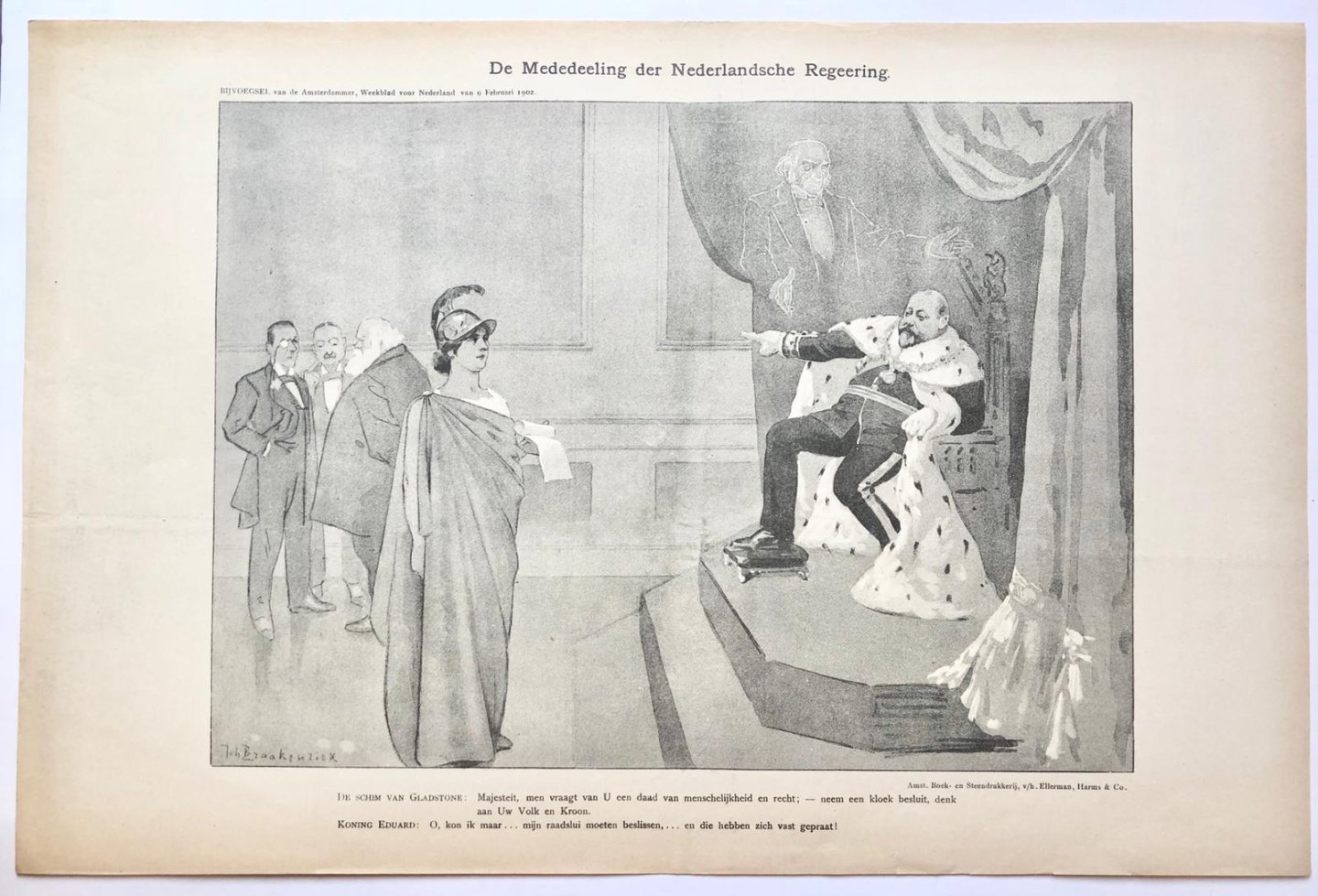 | Bijzonderheden: | 300 x 460 mm. Bijvoegsel van de Amsterdammer, Weekblad voor Nederland, van 9 Februari 1902. De Mededeeling der Nederlandsche Regeering. Pictured are De schim van Gladstone and Koning Eduard. (Koning Edward, King Edward) (koning van het Verenigd Ko... |