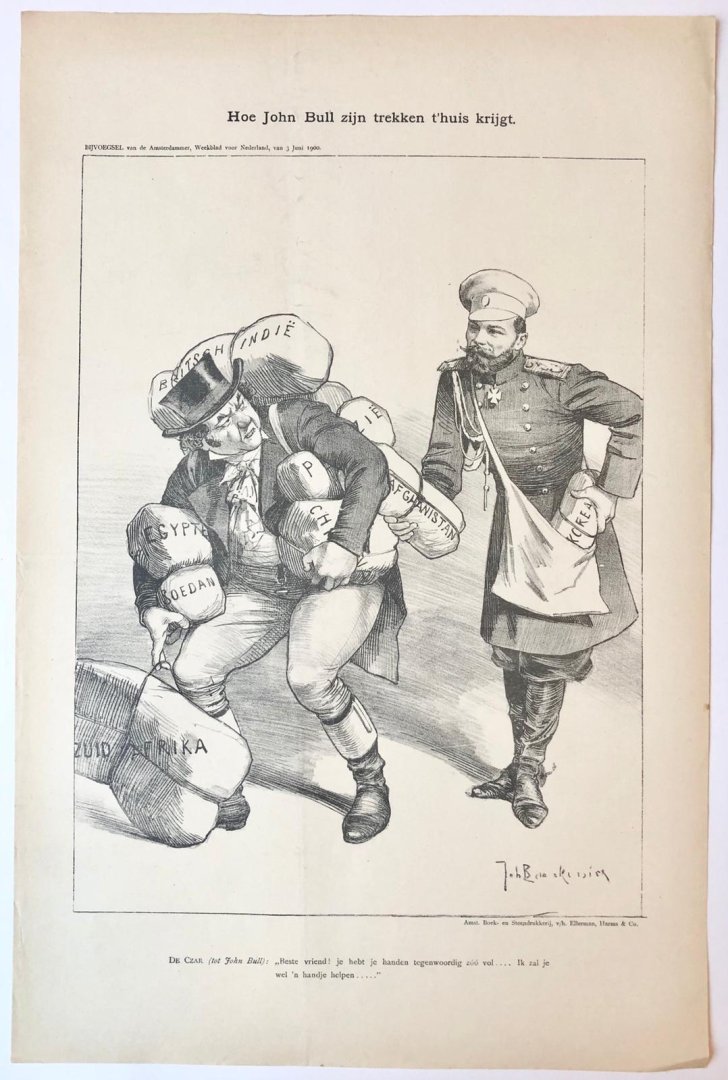 | Bijzonderheden: | 440 x 300 mm. Bijvoegsel van de Amsterdammer, Weekblad voor Nederland, van 3 Juni 1900. Hoe John Bull zijn trekken t'huis krijgt. Pictured are John Bull and De Czar (De Tsaar, The Tsar). Amst. Boek- en Steendrukkerij, v/h Ellerman, Harms & Co.... |