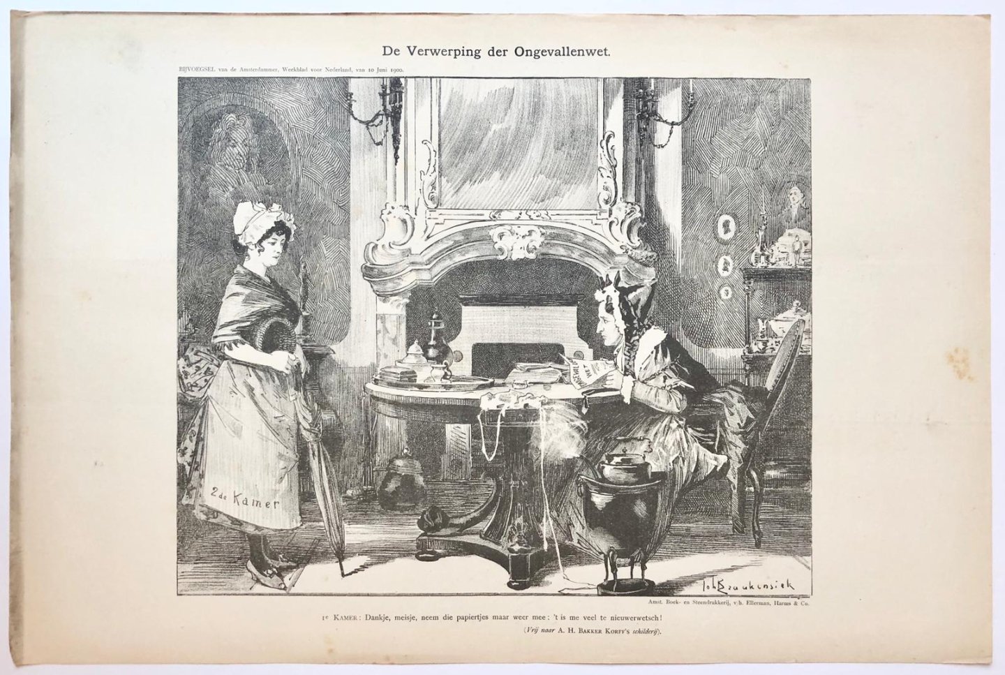 | Titel: | [Original lithograph/lithografie by Johan Braakensiek] De Verwerping der Ongevallenwet, 10 Juni 1900, 1 pp. |