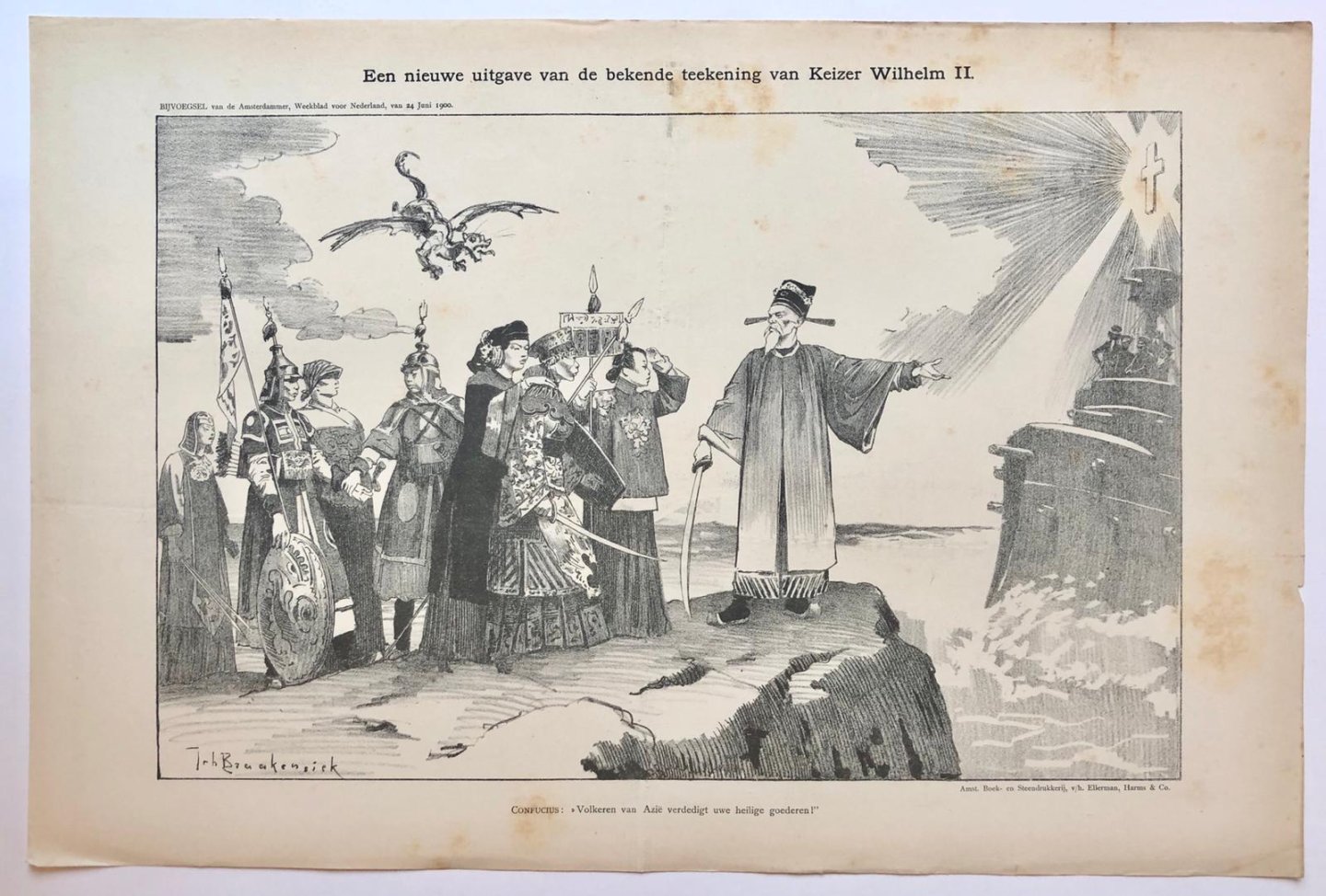 | Bijzonderheden: | 300 x 440 mm. Bijvoegsel van de Amsterdammer, Weekblad voor Nederland, van 24 Juni 1900. Een nieuwe uitgave van de bekende teekening van Keizer Wilhelm II. Pictured is Confucius (een Chinese filosoof en politicus tijdens de Zhou-dynastie, a Chines... |