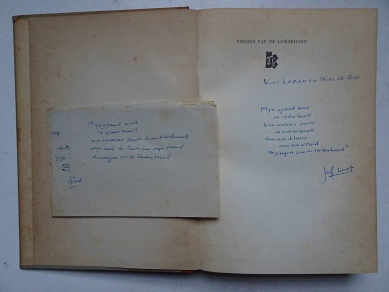 | Bijzonderheden: | 1947; Uitg. F.G. Kroonder; halflinnen; met illustraties van Fons Montens; gesigneerd met opdracht (aan Levien en Ivies de Bree) door Jef Last mét een handgeschreven gedichtje; 151 p. |