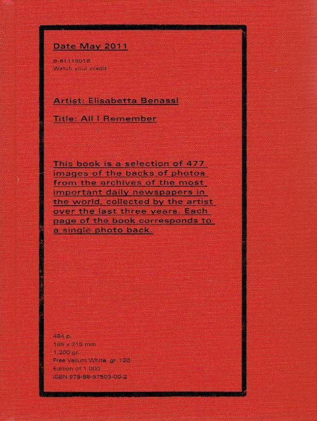 - 'This book is a selection of 477 images of the backs of photos from the archives of the most important daily newspapers in the world, colected by the artist over the last three years. Each page of the book corresponds to a single photo back.' - The result is an original history of our past, made of written images, of memorable moments from 20th century history by conceptual artist Elisabetta Benassi (b. 1966). - As new/new copy