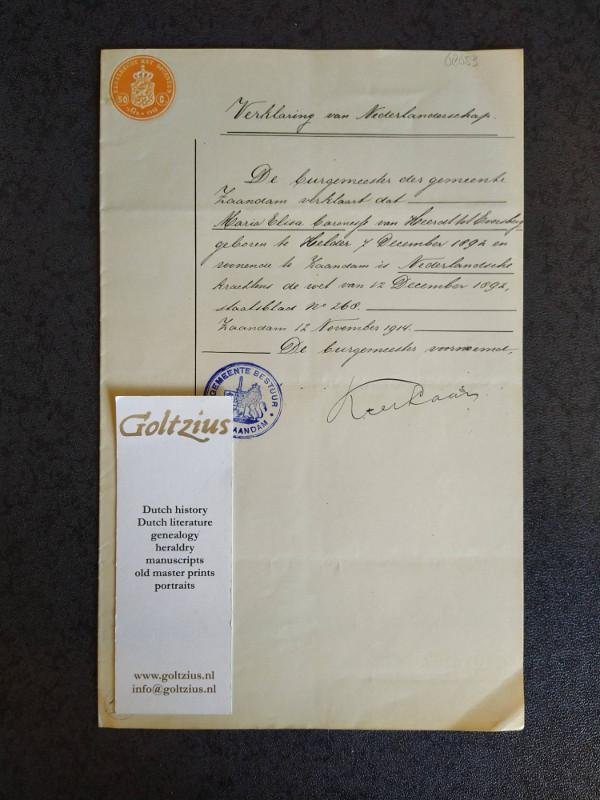 Verklaring van Nederlanderschap van Heerdt Single folded leaf with writing only on the front, 32x20 cm. Official document declaring that Maria Elisa baronesse van Heerdt tot Eversberg (1892 Den Helder -1973 Den Haag), now living in Zaandam, is of Dutch nationality. Signed by the mayor of Zaandam (K. ter Laan, 1871-1963) and dated to 12 November 1914. With a blue stamp beneath the handwritten text (Gemeentebestuur Zaandam) and an orange stamp in the top left corner (Zegelrecht met opcenten, 50 c., 'sGr. 1913). Maria Elisa was the daughter of Reinhart Frans, Baron van Heerdt tot Eversberg (1863 Paramaribo -1922 Apeldoorn) and Louise Engeline Charlotte Uilkens (1868 Tjandie -1961 Den Haag). She was born on 7 December 1892. The family Van Heerdt is part of the old nobility of Gelderland, with Gijsbert van Heerde as oldest known ancestor. Two branches of this family were admitted to the Royal Dutch nobilty in 1814 and 1822. The head of the branch Van Heerdt tot Eversberg was addressed as count (graaf), the other familymembers as baron or baroness.