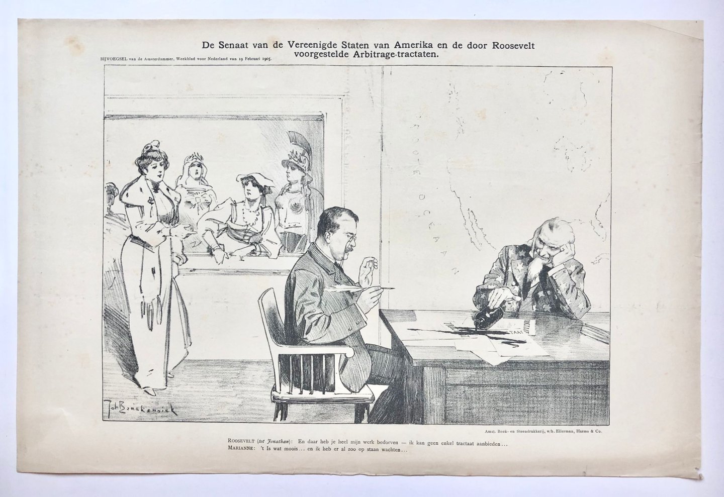 | Titel: | [Original lithograph/lithografie by Johan Braakensiek] De Senaat van de Vereenigde Staten van Amerika en de door Roosevelt voorgestelde Arbitrage-tractaten, 19 Februari 1905, 1 pp. |