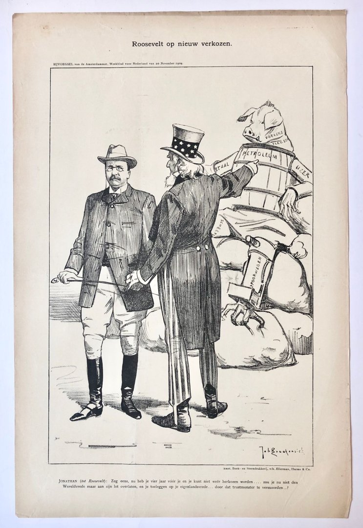 | Titel: | [Original lithograph/lithografie by Johan Braakensiek] Roosevelt op nieuw verkozen, 20 November 1904, 1 pp. |