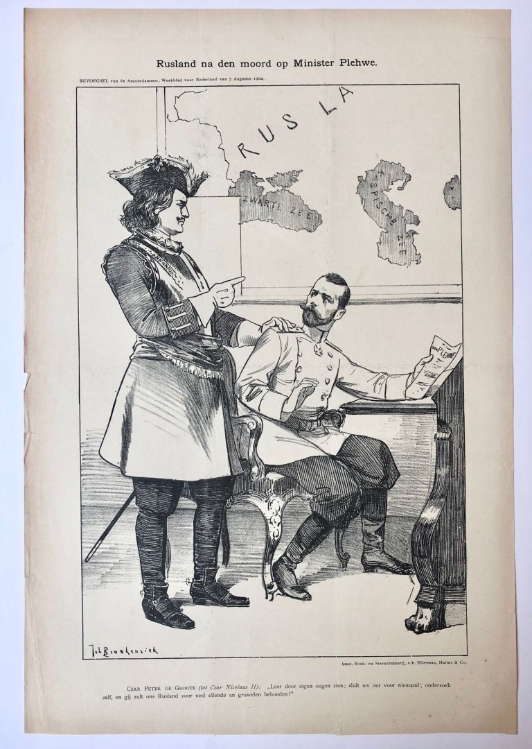 | Bijzonderheden: | 460 x 300 mm. Bijvoegsel van de Amsterdammer, Weekblad voor Nederland, van 7 Augustus 1904. Rusland na den moord op Minister Plehwe (Minister van Binnenlandse Zaken, Minister of Internal Affairs). Pictured are Czar Peter de Groote (Tsaar van Rusla... |