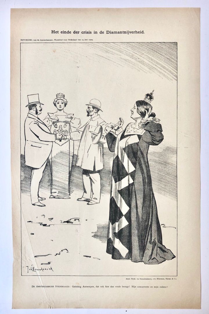 | Bijzonderheden: | 460 x 290 mm. Bijvoegsel van de Amsterdammer, Weekblad voor Nederland, van 19 Juni 1904. Het einde der crisis in de Diamantnijverheid. Pictured is De Amsterdamsche Stedemaagd. Amst. Boek- en Steendrukkerij, v/h Ellerman, Harms & Co. |