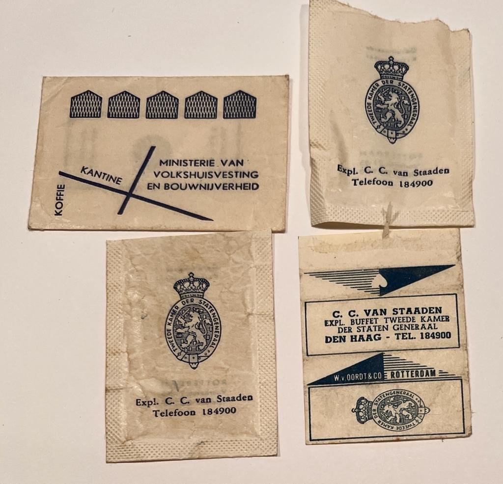 | Bijzonderheden: | Four sugar sachets: 1) Kantine Ministerie van Volkshuisvesting en bouwnijverheid, 2 and 3) Tweede Kamer der Staten Generaal and 4) just one side of the sachet with C.C. van Staaden, EXPL. Buffet Tweede kamer der Staten Generaal Den Haag. |