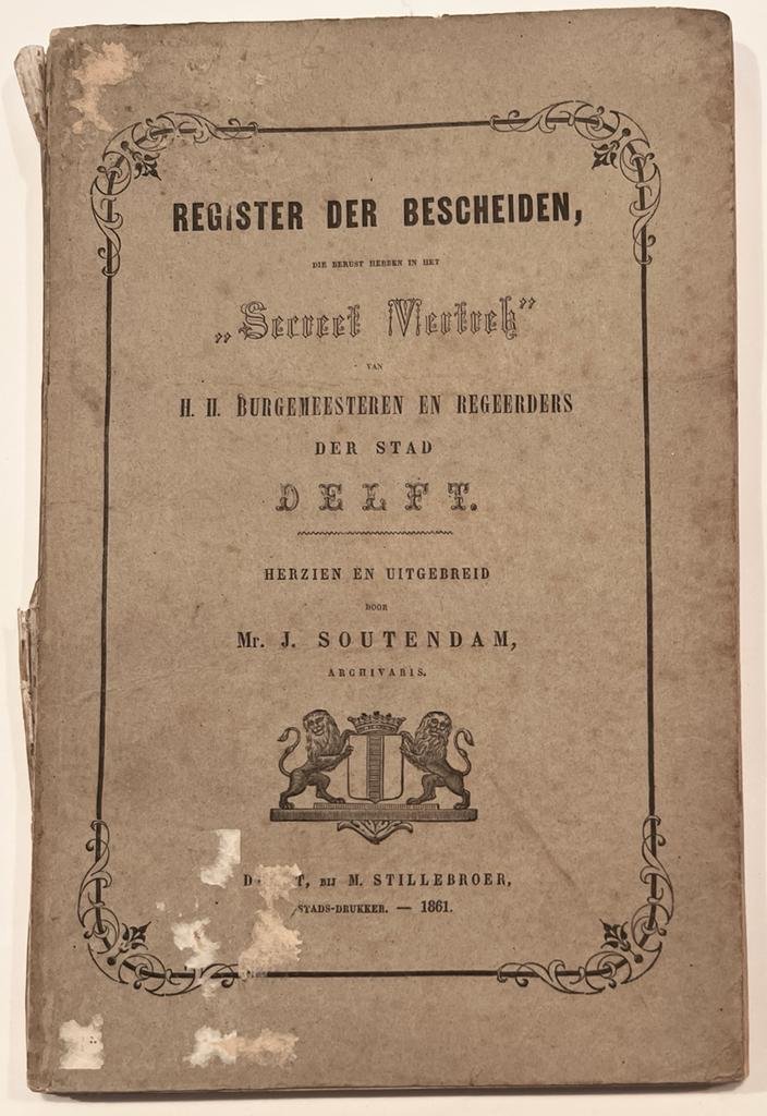 | Titel: | [Delft, 1861] Register der bescheiden, die berust hebben in het “Secreet vertrek” van H. H. Burgemeesteren en Regeerders der stad Delfst, Stads-drukker M. Stillebroer, Delft, 1861, 118 pp. |