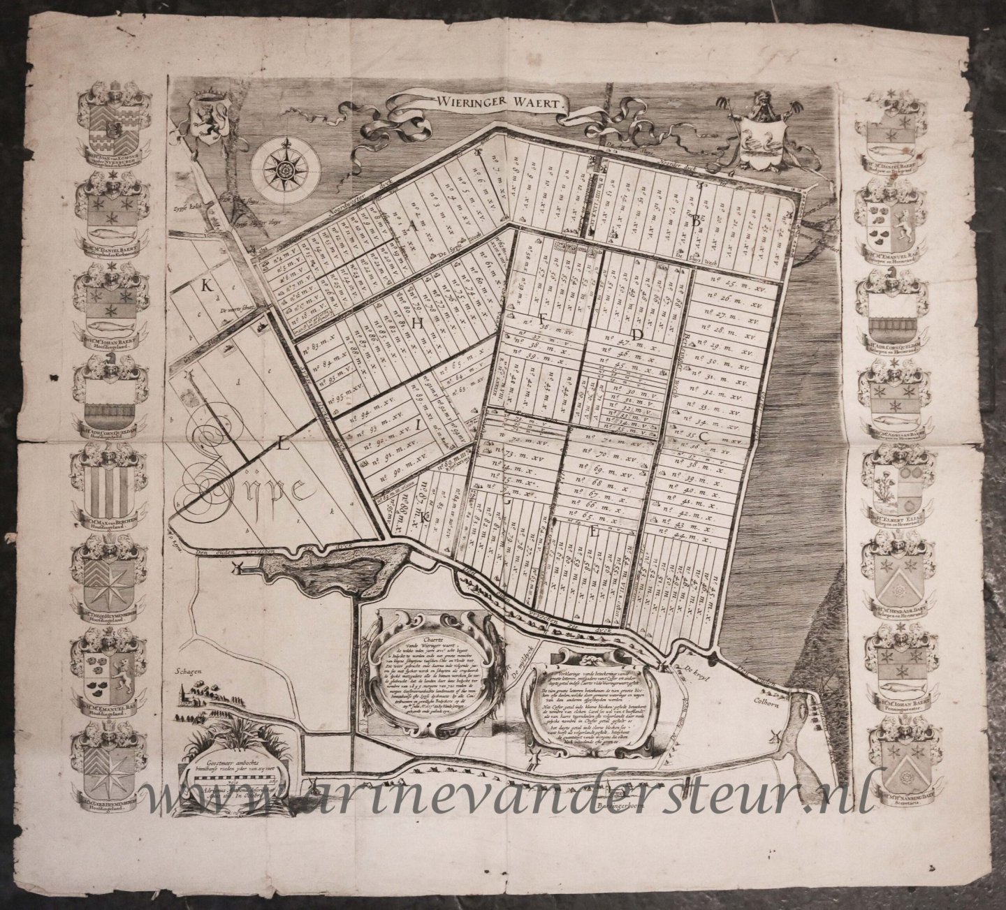 | Bijzonderheden: | Map of the lots of the Wieringerwaard, as raffled on 12 July 1611.On the top left the coat of arms of the county of Holland; on the top right the coat of arms of the Wieringerwaard. On the bottom right a cartouche with a scale stick: Geestmeer amb... |