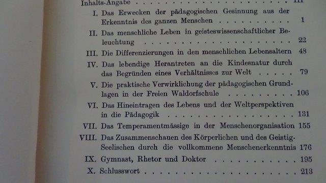 Der p?dagogische Wert der Menschenerkenntnis und der Kulturwert der P?dagogik. Inhalt (Auswahl): Das Erwecken der p?dagogischen Gesinnung aus der Erkenntnis des ganzen Menschen / Die Differenzierungen in den menschlichen Lebensaltern / Das lebendige Herantreten an die Kindesnatur durch das Begr?nden eines Verh?ltnisses zur Welt / Die praktische Verwirklichung der p?dagogischen Grundlagen in der Freien Waldorfschule / Das Hineintragen des Lebens und der Weltperspektiven in die P?dagogik / Das Temperamentm??ige in der Menschenorganisation / Vom Verh?ltnis der p?dagogischen Kunst zur anthroposophischen Bewegung. l Philosophisch-Antroposophischer Verlag am Goetheanum . Dornach 1929. Ln. 230 S. Sehr gut. Serifdruck.
