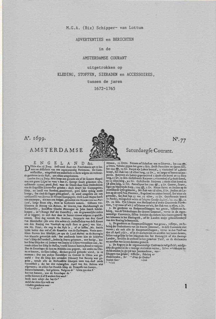 | Titel: | Advertenties en berichten in de Amsterdamse Courant uitgetrokken op Kleding, Stoffen, Sieraden en Accessoires, tussen de jaren 1672-1765 |