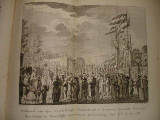 | Bijzonderheden: | 1787; Hendrik Arends. Halflinnen met gemarmerde platten. "Kunstplaaten":, uitslaande kopergravures, "Het bezichtigen van den Westcappelschen Dijk", "Verwelkoming Willem de V. in de vergadering der Heeren Staaten van Zeeland" en "Aankomst van Wille... |