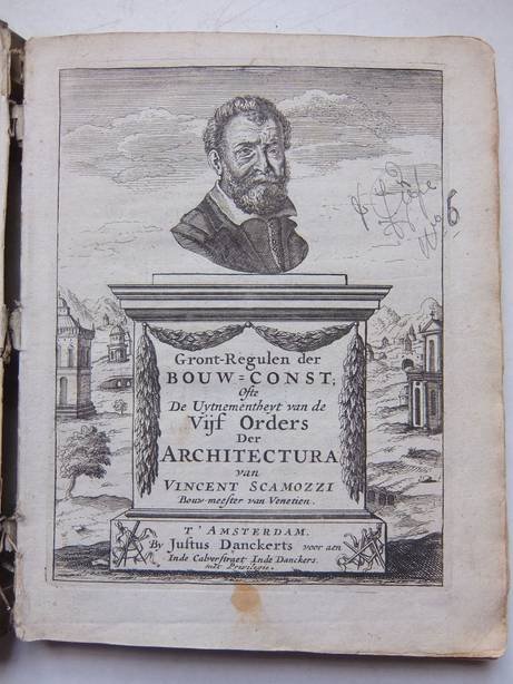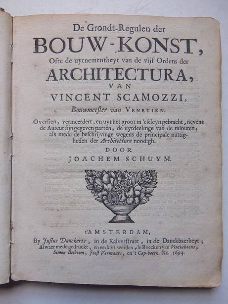 | Titel: | Gront-Regulen der Bouw-Konst, Ofte de uytnementheyt van de vijf Ordens der Architectura, van Vincent Scamozzi, Bouwmeester van Venetien. Oversien, vermeerdert, en uyt het groot in 't kleyn gebracht, nevens de Auteur sijn gegeven parten, de uyt... |