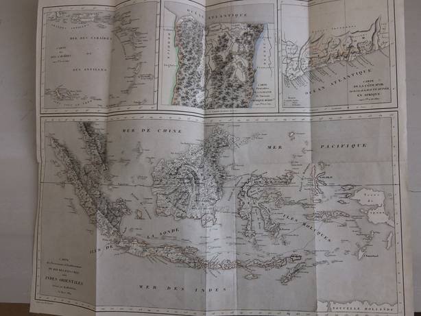 | Uitgever: | Paris, Binet, 1839. 2 vols.in 1. Oblong 4to. With 3 engr. titles & 12, 9 (of10) and 36 (of 37) steel-engr. maps (incl. 3 fold.), handcoloured. Halfleather with marbled boards. Incl. folded map: Carte des Pays-Bas aux Indes Orientales, Carte des An... |