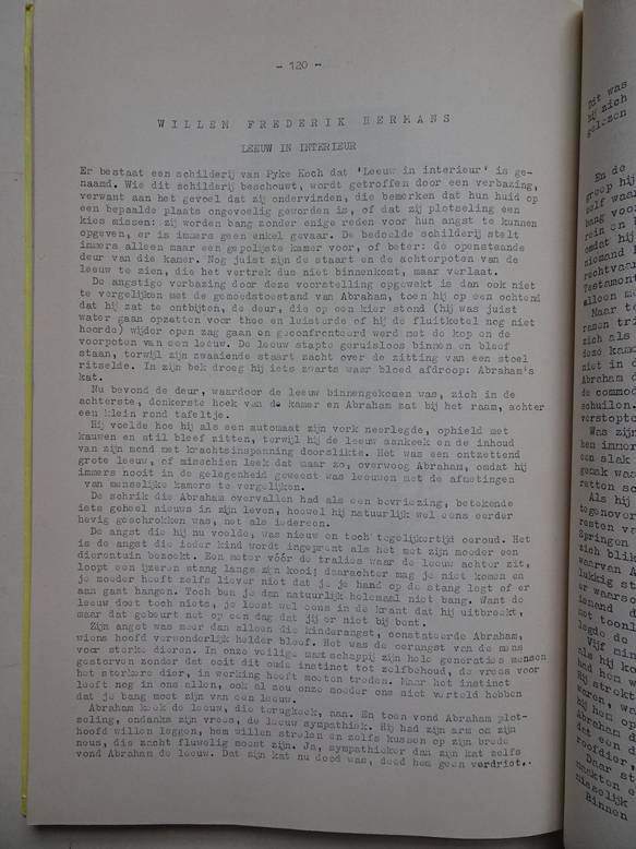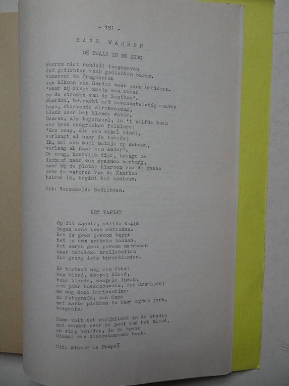 | Bijzonderheden: | 1979; drukkerij Vreeland; softcover; touw-binding; no. 86 van 300 genummerde exemplaren; typoscript; bijdragen van o.a. Willem Frederik Hermans, Hans Warren, Paul Rodenko, Jan Zitman en Jan Vermeulen; met ill. van Hans Aalderink, Joost Baljeu, Ph... |
