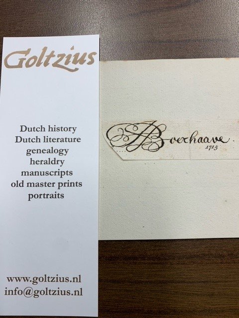 | Meer info: | Autograph of Herman Boerhaave. 1715, dated and glued on to later paper. Not certain if it is an original. with 19th century text glued on reverse of this paper concerning the biography of Boerhaave. |