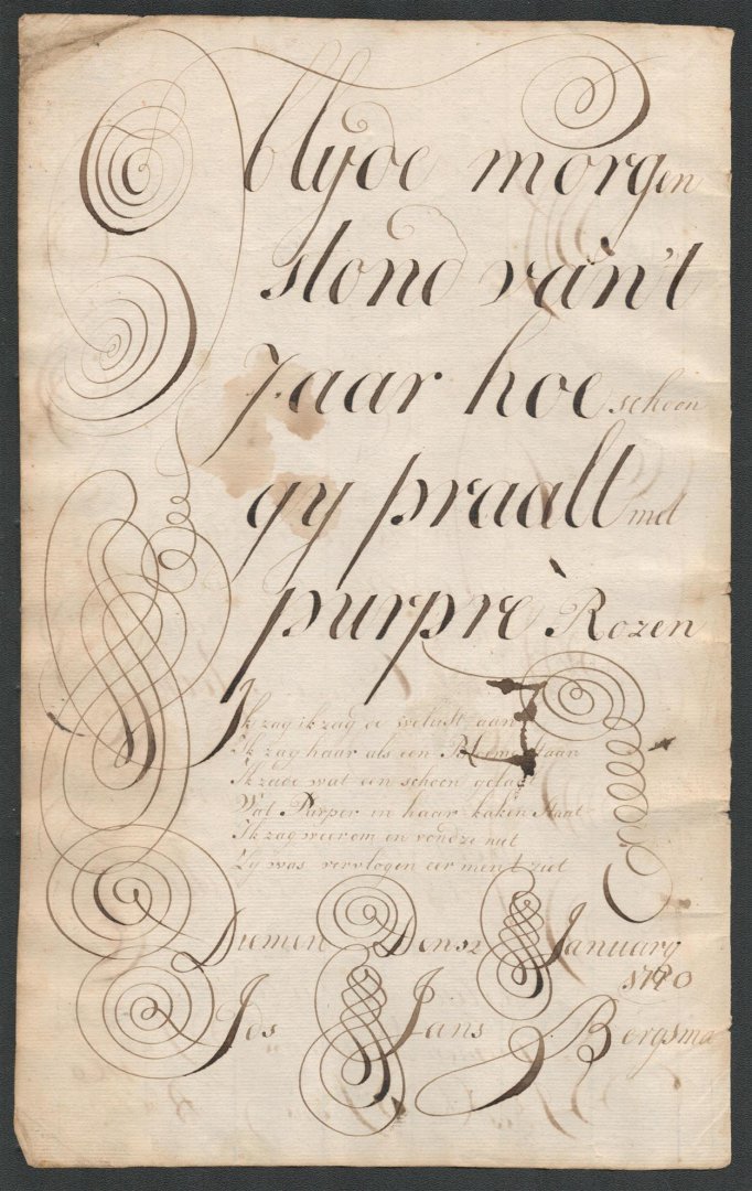| Titel: | (HANDSCHRIFT - SIERSCHRIFT) Blijde morgenstond van't jaar hoe schoon gij praalt met purpre rozen |
