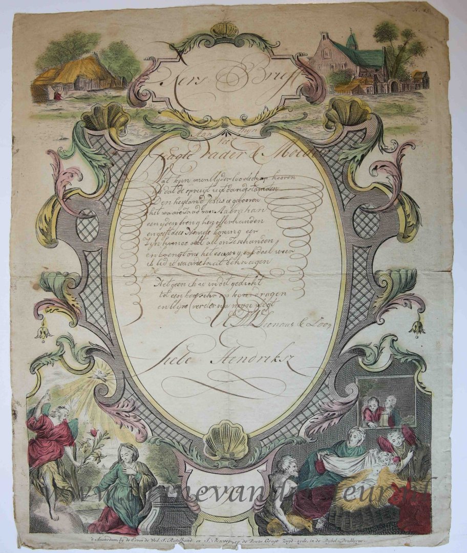 | Bijzonderheden: | Rococo decorative print employed as a wish card; handcolored. At the top corners a farm and a church; at the bottom, the Annunciation (boodschap aan Maria) and the scene of the Nativity (geboorte van Christus, kerstmis) with two children peaking ... |