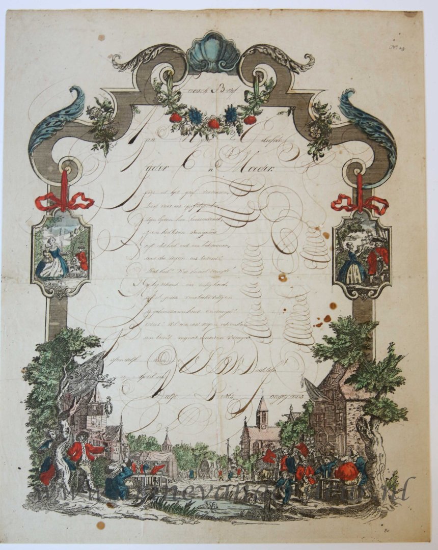 | Bijzonderheden: | Decorative print employed as a wish card.Wish letter with decorative frame with drinking peasants in front of an inn. Handwritten message in calligraphy (Easter Wish) by Antje Letis Jongejans. Numbered top right: 23, and on the bottom right: 80... |