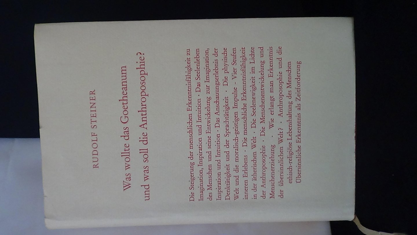 Was wollte das Goetheanum und was soll die Anthroposophie? GA 84. Dieser Band enth?lt die letzten ?ffentlich gehaltenen Vortr?ge Rudolf Steiners zu Grundfragen der Anthroposophie. In der Zeit nach der Vernichtung des ersten Goetheanumbaues in der Silvesternacht 1922/23 stellt er in ihnen die innere und ?u?ere Notwendigkeit des anthroposophischen Impulses in der heutigen Zeit nochmals eindr?cklich dar. Inhalt: Was wollte das Goetheanum und was soll die Anthroposophie? / Die Steigerung der menschlichen Erkenntnisf?higkeit zu Imagination, Inspiration und Intuition / Das Seelenleben des Menschen und seine Entwickelung zur Imagination, Inspiration und Intuition / Das Anschauungserlebnis der Denkt?tigkeit und der Spracht?tigkeit / Die physische Welt und die moralisch-geistigen Impulse. Vier Stufen des inneren Erlebens / Die menschliche Erkenntnisf?higkeit in der ?therischen Welt / Die Seelenewigkeit im Lichte der Anthroposophie / Menschenentwickelung und Menschenerziehung / Die ?bersinnliche Erkenntnis. Anthroposophie als Zeitforderung / Die Anthroposophie und die ethisch-religi?se Lebenshaltung des Menschen / Wie erlangt man Erkenntnis der ?bersinnlichen Welt? l Verlag der Rudolf Steiner Nachlassverwaltung . Dornach 1961. Ln. 292 S. Umschlag, Lesezeichen. Sehr gut.