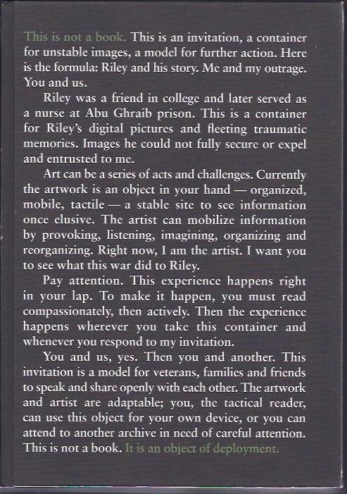- First edition of 1000 copies. - This is not a book - This is an invitation, container for unstable images, a model for further action. Here is the formula: Riley and his story. Me and my outrage. You and us. - Riley was a friend in college and later served as a nurse at Abu Ghraib prison. This is a containe for Riley's digital pictures and fleeting traumatic memories. Images he could not fully secure or expel and entrusted to me. [...] - Light edgewear, otherwise a good copy