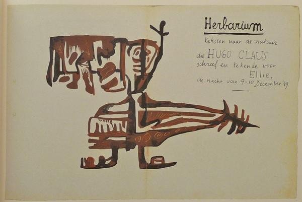 Groot oblong.\nIn de nacht van 9 op 10 december 1949 schreef Hugo Claus voor zijn geliefde een van de merkwaardigste dichtbundels uit zijn rijke oeuvre. De bundel Herbarium bevat 15 prozagedichten in handschrift bij evenveel tekeningen op groot formaat. het wel had gepubliceerd, had het binnen de toenmalige literaire context de indruk gewekt van een andere planeet te komen. Internationaal gezien sloot het wel aan bij de experimenten van COBRA en bij het Franse surrealisme. kunnen worden, gepubliceerd. Het betreft onder meer een later toegevoegde commentaarbladzijde, een vroegere versie van de gedichten, een Franse vertaling ervan, een kladversie van die vertaling, alsook twee latere remakes van de oorspronkelijke teksten. unieke uitgave en schreef een uitvoerig commentaar. Achtereenvolgens komen aan bod: de context waarin het werk tot stand kwam, de bundel als geheel en de afzonderlijke gedichten.