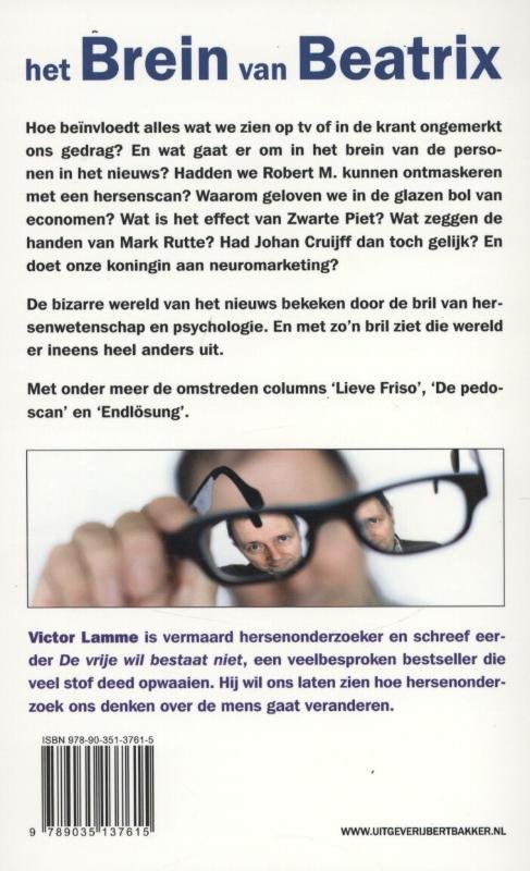 Hoe beïnvloedt alles wat we zien op tv of in de krant ongemerkt ons gedrag? En wat gaat er om in het brein van de personen in het nieuws? Hadden we Robert M. kunnen ontmaskeren met een hersenscan? Waarom geloven we in de glazen bol van economen? Wat is het effect van Zwarte Piet? Wat zeggen de handen van Mark Rutte? Had Johan Cruijff dan toch gelijk? En doet onze koningin aan neuromarketing? De bizarre wereld van het nieuws bekeken door de bril van hersenwetenschap en psychologie. En met zo'n bril ziet die wereld er ineens heel anders uit.Met onder meer de omstreden columns 'Lieve Friso', 'De pedoscan', en 'Endlösung'.Victor Lamme is vermaard hersenonderzoeker en schreef eerder De vrije wil bestaat niet, een veelbesproken bestseller die veel stof deed opwaaien. Hij wil ons laten zien hoe hersenonderzoek ons denken over de mens gaat veranderen.