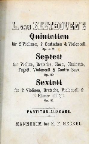 | Titel: | L. van Beethoven`s Quintetten für 2 Violinen, 2 Bratschen & Violoncell, op. 4, 29. Septett für Violine, Bratsche Horn, Clarinette, Fagott, Violoncell & Contra bass, op. 20. Sextett für 2 Violinen, Bratsche, Violoncell & 2 Hörner obligat., op. ... |