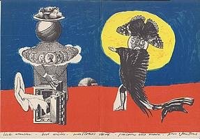 1. 'Bon jour, bon mois, bon an et bonne estrenne'. Gevouwen blad stevig papier, bedrukt in rood met een oud-Franse tekst naar een chanson van Guillaume Dufay. Met originele linosnede in zwart. In potlood gesigneerd 'Jan en Noor/ Bons'. Circa 1960. 2. 'Beste wensen - best wishes - meilleurs voeux - próspero año nuevo'. Gevouwen blad bedrukt met een litho in rood, geel, donker- en lichtblauw en zwart. In druk gesigneerd. Met stempel van Jan Bons. Zeer verschillende nieuwjaarswensen, de eerste klassiek, de tweede modern.
