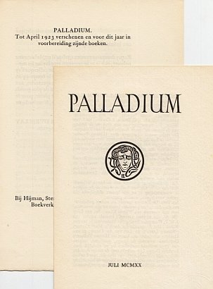 1. Palladium. Juli 1920. Vouwblad. Met op de voorzijde het Palladium-vignet door Bernard Essers. Op Haesbeek. * Eerste prospectus, waarin wordt medegedeeld dat vijf door Van Krimpen uitgegeven titels zijn overgenomen door Palladium ('pre-Palladium') en dat als eerste titel is verschenen Deirdre en de Zonen van Usnach door A. Roland Holst. 2. Joan Luykens Duytse lier. 1921. Vouwblad. Op geschept papier met watermerk 'Palladium'. 3.Palladium. Tot Januari 1922 verschenen boeken. 1922. Geniet. (8) p. Onopengesneden. Op geschept papier met watermerk 'Palladium'. 4. Hetzelfde werk. Op gewoon papier. 5. Palladium. Inkeer, verzen van P.N. van Eyck. April 1922. Plano. Alleen recto. Op gewoon papier. 6. Palladium. Tot April 1923 verschenen en voor dit jaar in voorbereiding zijnde boeken. 1923. Geniet. (8) p. Op papier met watermerk 'Palladium'. Beeldschoon, vroeg, heftig programmatisch werk van Jan van Krimpen - felle teksten gedrukt op mooi papier.