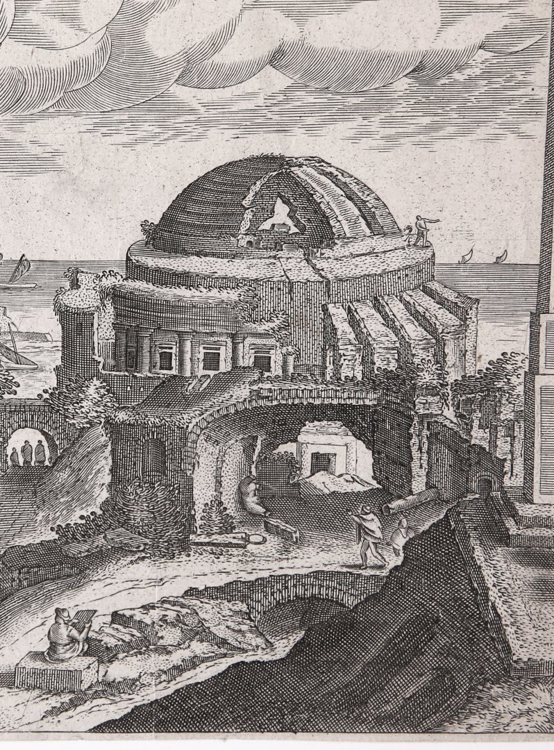 | Bijzonderheden: | Landscape by the sea with ruined buildings. Groups of travelers looking at the ruins and an artist sitting in the bottom center, drafting the landscape. |