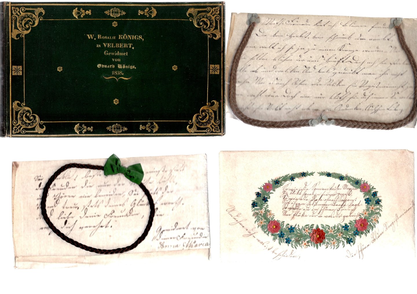 | Titel: | Album amicorum of Rosalie Könings, mainly Velbert and Elberfeld, German, 1838-1849, containing 21 contributions of which 19 manuscripts (3 with mounted piece of braided hair), 1 coloured drawing and 1 "knipkunst" guirlande. |